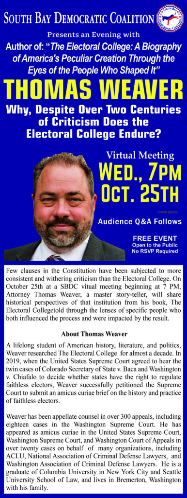 You are invited to an evening with author Thomas Weaver as he discusses the history of the problematic Electoral College vote counting system. The links to this presentation are below. Hope to see you there. For more information on our club, visit: southbaydemocraticcoalition.org