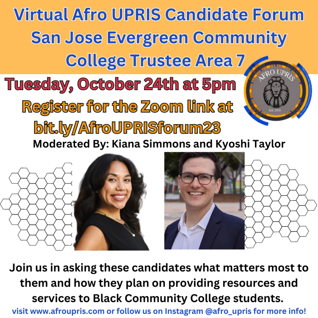 Afro UPRIS is hosting a Candidate Forum on Tuesday, October 24th at 5pm on Zoom for San Jose-Evergreen Community College District, Trustee Area 7.