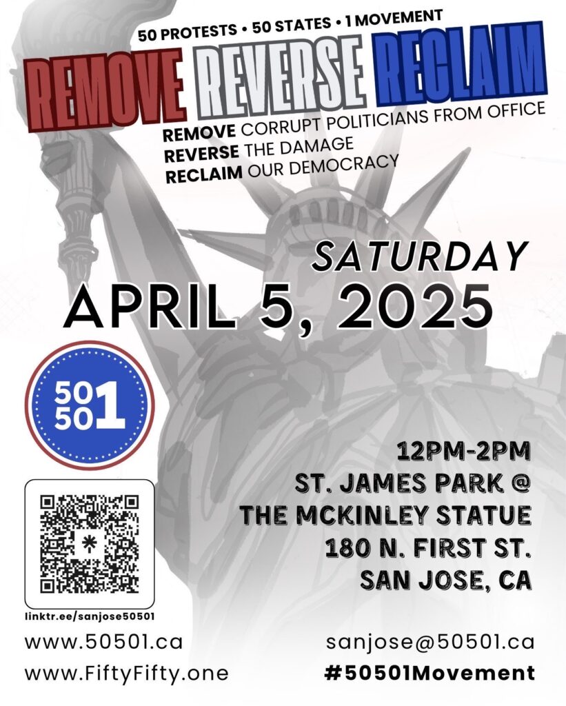 “After two months of congressional inaction, on April 5th, 50501 San Jose demands that the U.S. House of Representatives and Senate take action and Remove President Trump and VP JD Vance from office due to their illegal actions, Reverse the unconstitutional executive orders, and Reclaim our democracy with campaign finance reform to ensure all Americans have a fair voice in our government moving forward.”