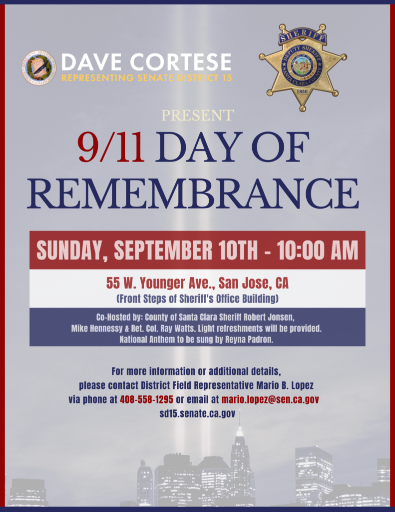 On behalf of Senator Dave Cortese and County of Santa Clara Sheriff Robert “Bob” Jonsen, we invite you and your Democratic Club’s Membership to join them on Sunday, September 10th, 2023 from 10 AM to 11 AM at their 9/11 Day of Remembrance Ceremony and Reception.