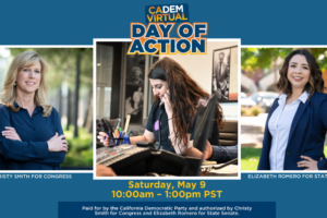 This day of action will be kicked off with a Town Hall with CA Democratic Party Chair Rusty Hicks and the candidates at 10:00 a.m. The virtual rally will be followed by an immediate action to make calls to voters in CD-25 and SD-28. You get to choose who you’d like to make calls for — Christy or Elizabeth!