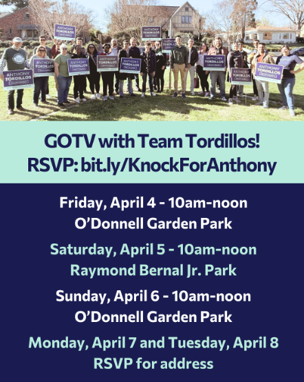 It’s GOTV time and our endorsed candidate, Anthony Tordillos, needs all hands on deck for a safer, more affordable, and more vibrant San José. Let’s do our part to get the results we need on April 8th by joining Team Tordillos for canvassing and phone banking.