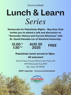 The Democrats for Palestinian Rights – Bay Area Club, chartered under the Santa Clara County Democratic Party, invites you and your staff to an educational Lunch & Learn session with a timely topic: Genocide: History and Current Dilemmas with Dr. David Palumbo-Liu from Stanford University. This is an opportunity to learn as we bear witness to the intentional starvation of Palestinians in Gaza, Palestine.