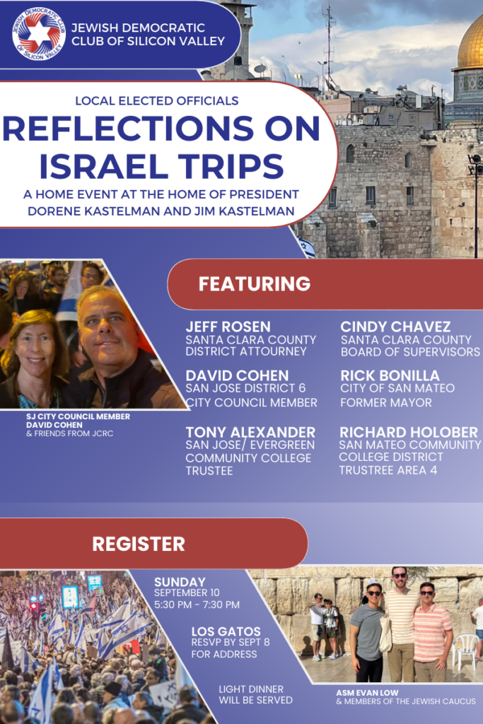 JDCSV formally invites all members and friends to an event hosted by and at the home of Dorene and James Kastelman in honor of our Elected Officers who have gone to Israel on sponsored trips. Many have asked to share their experiences on these trips with our members and communities.