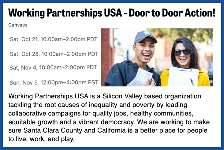 Join us at our in-person canvass action as we reach out to voters and engage them in the We Are California movement! We will be educating voters on the importance of having corporations pay their fair share in taxes and advocating for affordable housing here in the Silicon Valley.