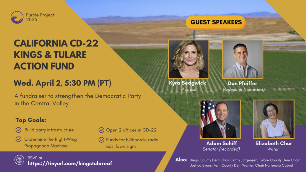 Hear from actor Kyra Sedgwick and writer Elizabeth Chur, with video appearances by Senator Adam Schiff and political strategist Dan Pfeiffer, about how MAGA is damaging Central Valley communities and about the need to mount a strong, year-round Democratic resistance.