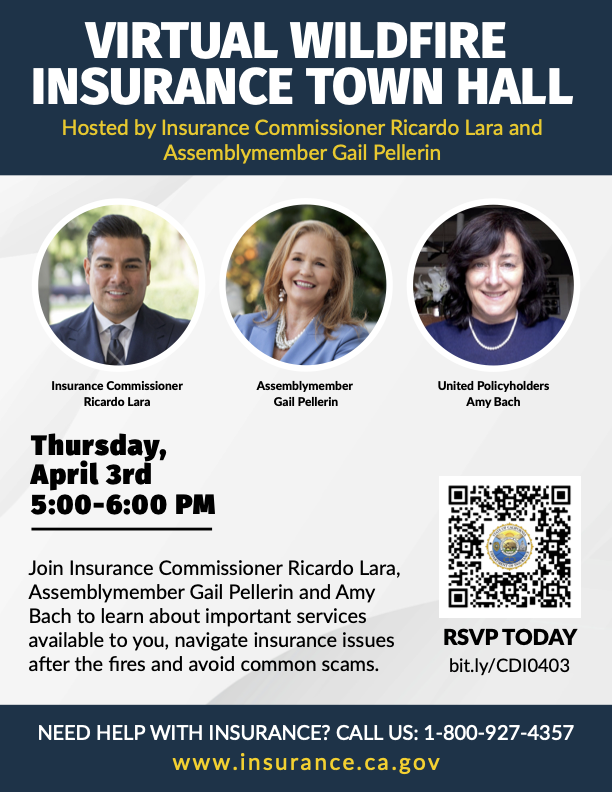 Assemblymember Gail Pellerin invites you to join her, Insurance Commissioner Ricardo Lara, and Amy Bach from United Policyholders for an important and timely virtual town hall addressing wildfire insurance issues impacting our community.
