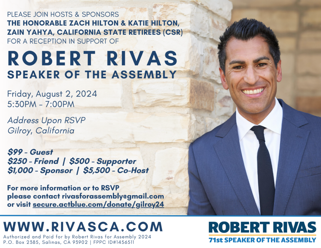 Come join us August 2 from 5:30pm to 7:00pm for a reception in support of Speaker of the Assembly Robert Rivas.. We are looking for Hosts and Sponsors too. https://secure.actblue.com/donate/gilroy24
