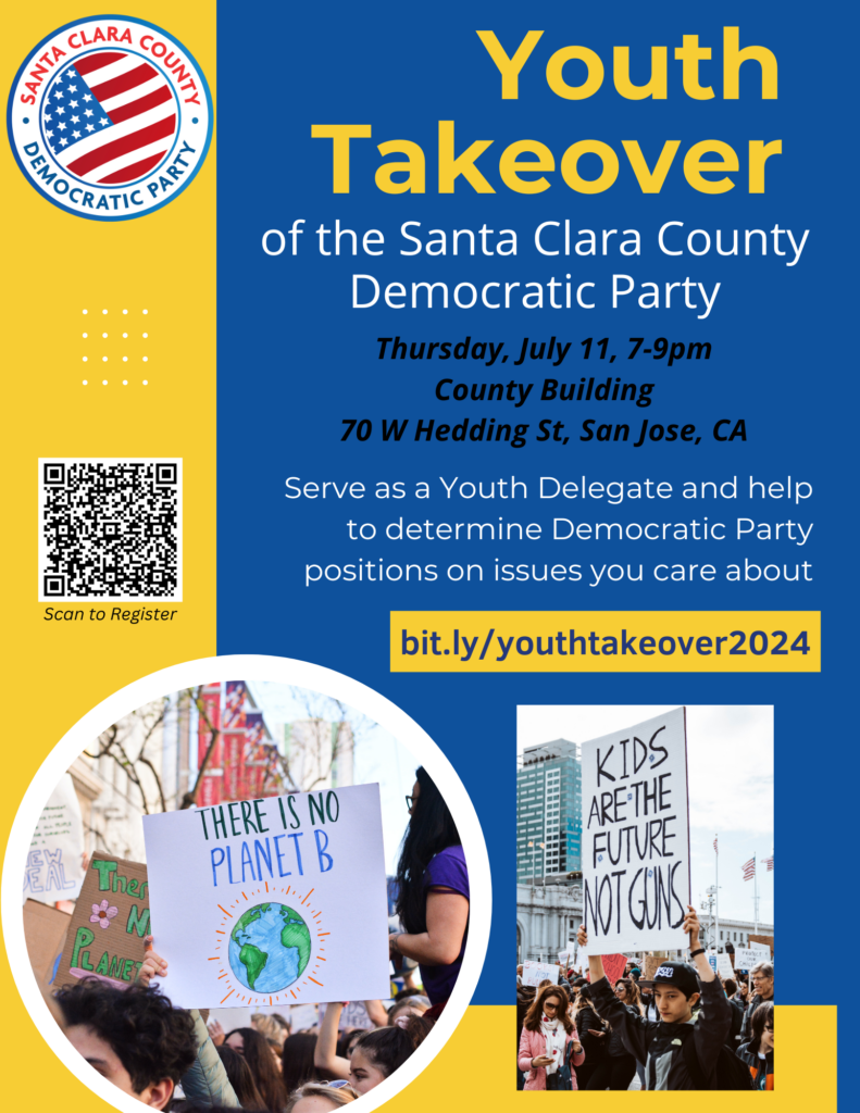 To honor, activate, and train young leaders in our local area, our regular monthly meeting of the Santa Clara County Democratic Central Committee on July 11, 2024, 7pm-9pm, will be a “Youth Takeover” meeting, in which the elected and appointed delegates of the Central Committee will take a seat and allow youth delegates to conduct the meeting, including by introducing, debating, and adopting resolutions. At the end of the meeting, the resolutions adopted by the youth delegates will be considered by the Central Committee as a consent calendar, and those items not pulled from consent will be adopted by the Central Committee as the official positions of the Santa Clara County Democratic Party.