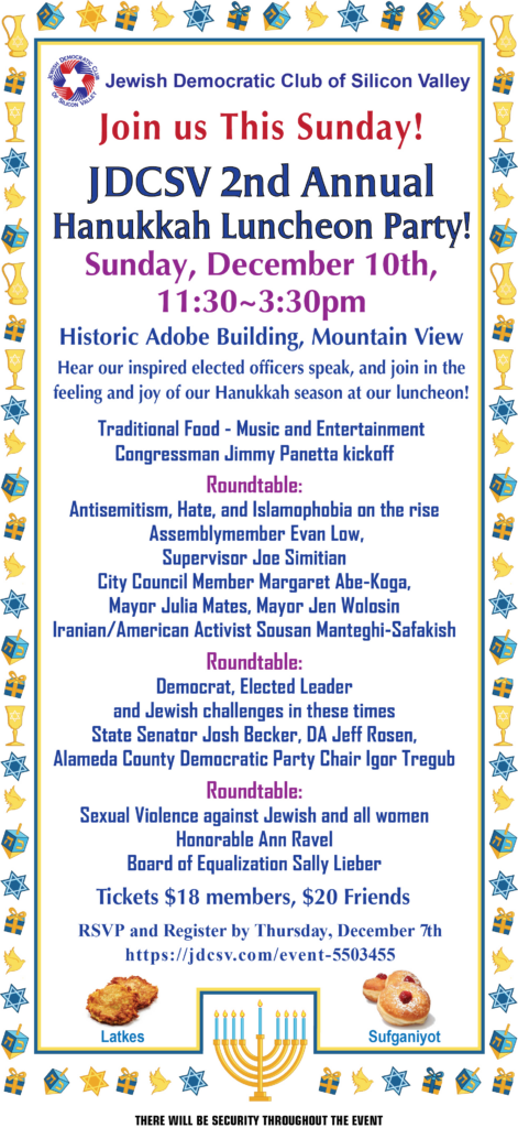 All JDCSV Members and friends are invited to join us on Sunday, December 10, 11:30am-2:30pm, at the Historic Adobe Building, Mountain View, for our 2nd Annual Hanukkah luncheon and holiday party!