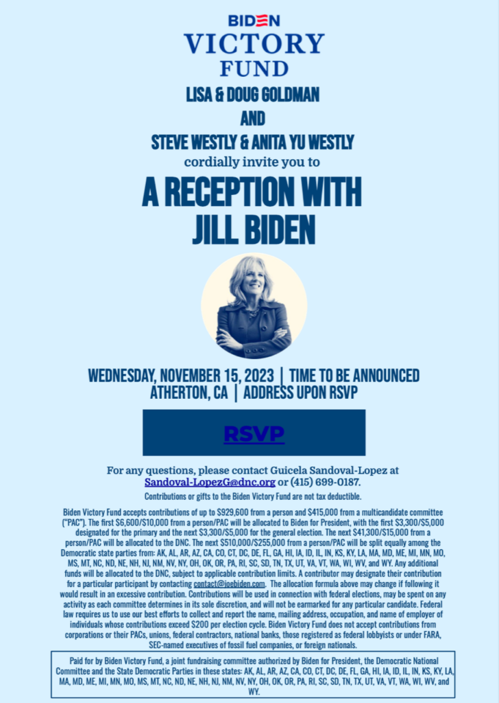 Please see the below information regarding a fundraiser event next Wednesday, November 15, in Atherton, featuring First Lady Jill Biden.