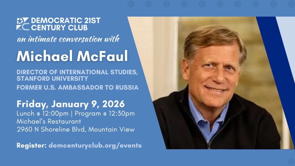 The Democratic 21st Century Club invites you to join them for a special program to kick off the new year featuring a conversation with Michael McFaul, former U.S. Ambassador. Mr. McFaul currently serves as Director of the Freeman Spogli Institute for International Studies, the Ken Olivier and Angela Nomellini Professor of International Studies at the Department of Political Science, and Peter and Helen Bing Senior Fellow at the Hoover Institution, all at Stanford University. He is also an international affairs analyst for NBC News.