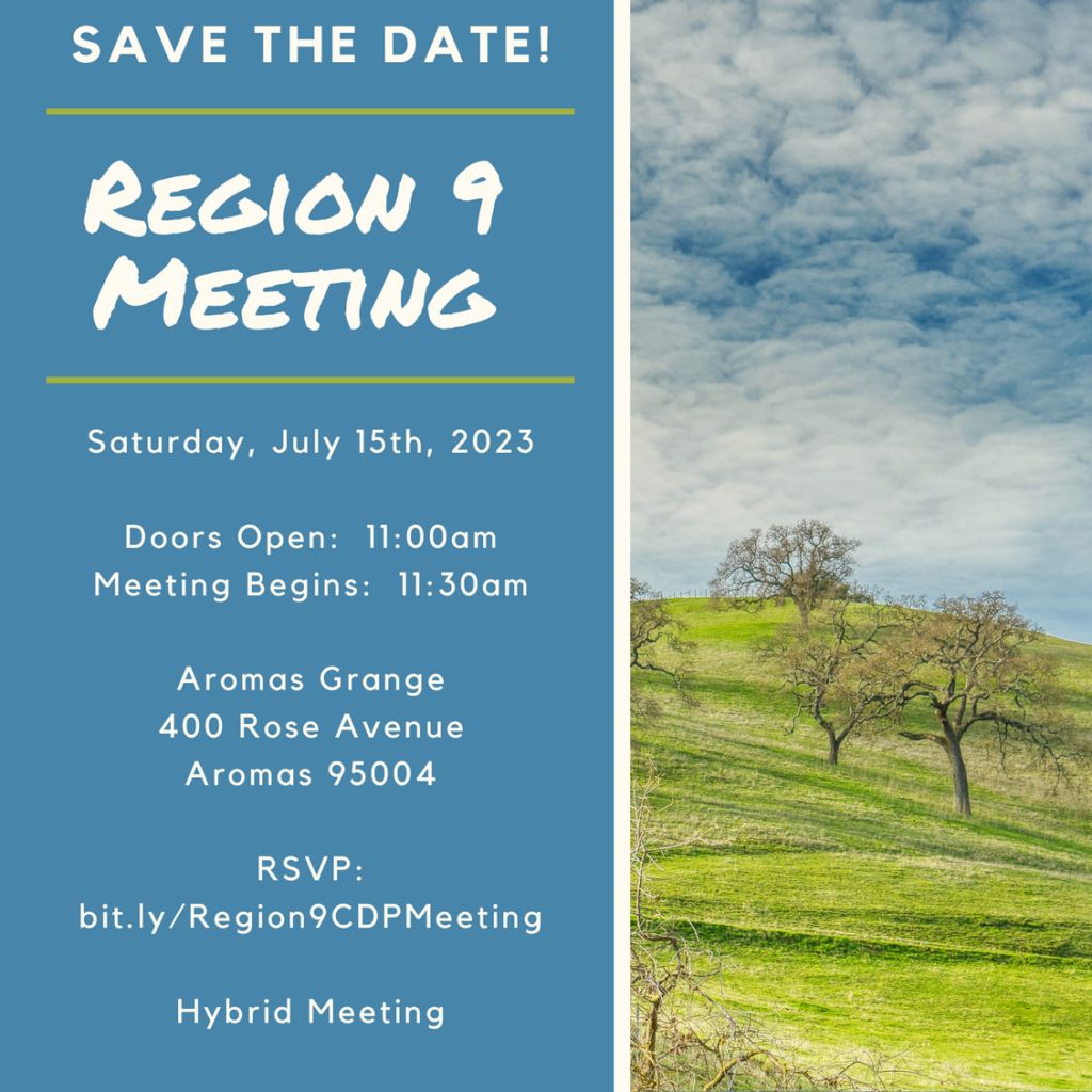 Register for upcoming virtual testimony hearings. For the testimony hearing schedule and additional information regarding the Platform Committee, please visit the Platform Committee webpage. I look forward to seeing many of you at our Regional Meeting on July 15th. If you have any questions, please don’t hesitate to reach out at Region9CDP@gmail.com.
