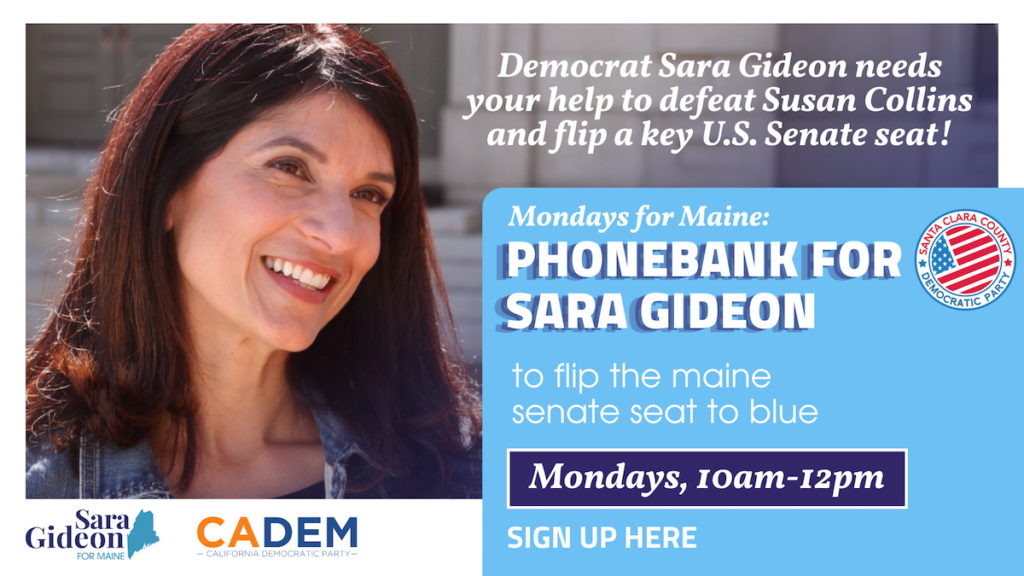 Join us in helping to elect Sara Gideon and help us to flip this US Senate seat from red to BLUE. You can sign up for any of our Monday events at: https://www.mobilize.us/laandbayarea/event/324074/